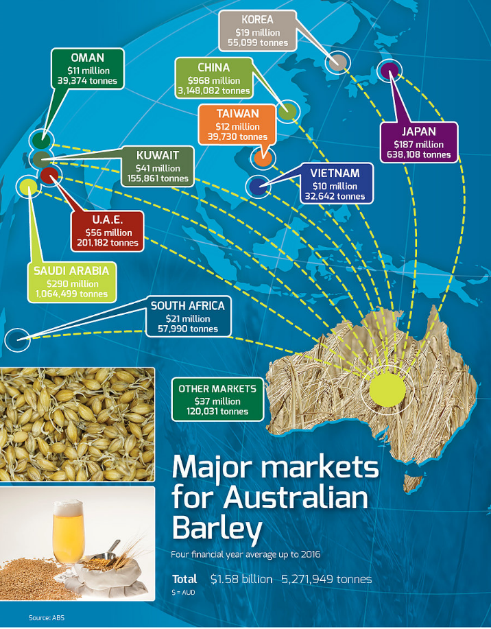 澳大利亚是大麦的主要出口国,它供应了全球30%-40%的酿造大麦出口,和20%的饲料大麦出口。作为酿造和饲料的原料澳洲大麦具有极高的品质,因此在国际和国内都有很大的需求量。目前在澳洲,新品种的酿造大麦正在通过澳洲大麦理事会管理的一个自愿认证流程被评估和认可。