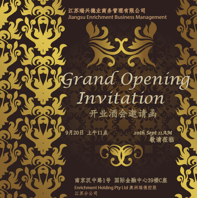 Enrichment Holding request the pleasure of your present at our opening event for our Jingsu new branch.