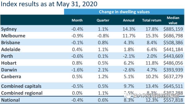 澳大利亚统计局数据显示,2020年第一季度悉尼房地产价格上涨1.9%,其中土地别墅价格上涨2.6%,公寓价格上涨了0.8%;墨尔本的房产价格上涨了2.1%,土地别墅价格上涨2.3%,公寓价格上涨了1.5%。