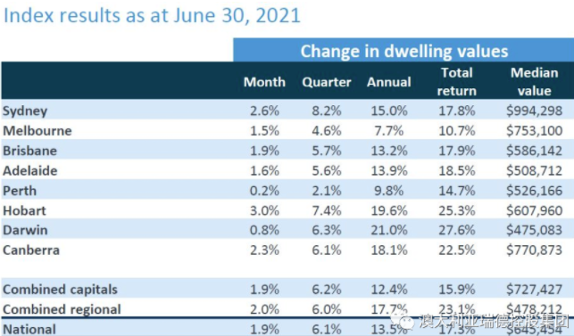 在首府城市中,达尔文保持了最高的年增长率,在财政年度中增长了21.0%,其次是霍巴特(19.6%)。在整个澳大利亚郊区中,新南威尔士州地区的住宅价值的年增长率最高(21.1%),其次是塔斯马尼亚地区(20.8%)。