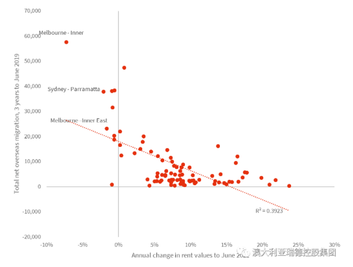 图4绘制了截至2019年6月的三年(疫情前的一项衡量指标)的净海外移民总数,对比了SA4市场租金价值的年度变化