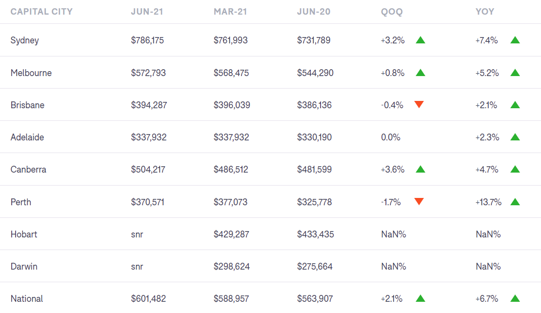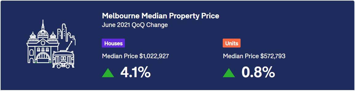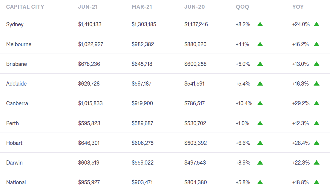 墨尔本的房价已经加入了这个价值100万澳元的俱乐部,在6月份的季度里上涨了近41,000澳元。自墨尔本在2020年末摆脱封锁以来,房价迅速上涨,连续三个季度增长超过4%,这是自GFC后反弹以来所未见的。这导致了11年来最强劲的年度增长,增长了16.2%,即142,000澳元。