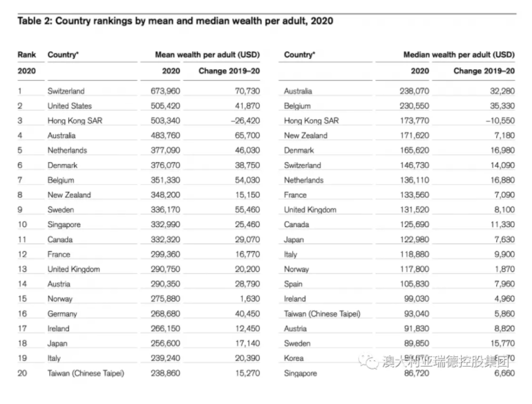 比利时的人均财富中值为230,500美元,香港为173,770美元,新西兰紧随其后,人均财富中值为171,620美元。(这意味着这些国家中一半的人拥有比这更多的财富,另一半的人拥有更少。如果使用“平均数”而不是“中位数”,澳大利亚的人均财富将会上升到48万3760美元,因为平均数掩盖了财富分配的不平衡。)