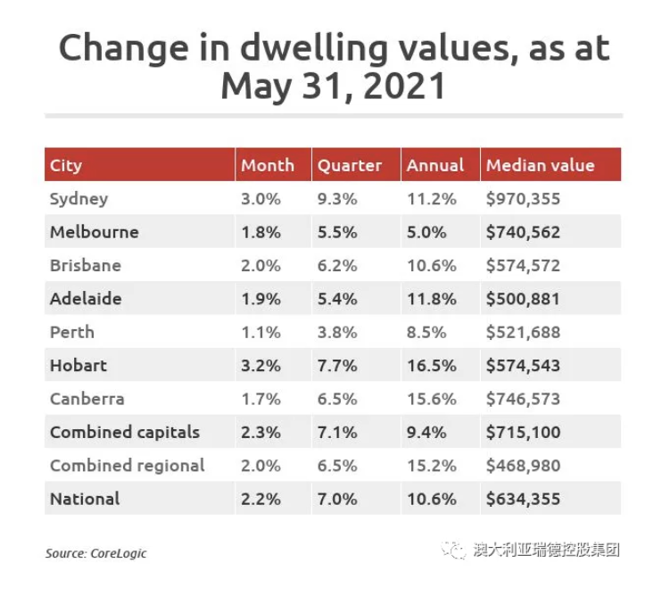 根据CoreLogic的数据,5月底全国房地产价格较去年同期上涨10.6%,霍巴特和堪培拉的这一数字分别为16.5%和15.6%。