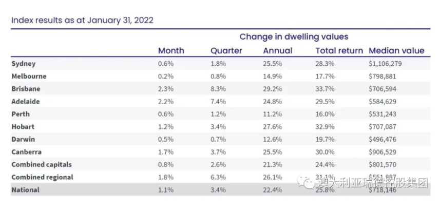 CoreLogic的全澳房价指数在1月份上升了1.1%,比12月份上升了10个基点,当时全澳房价指数上升了1.0%。在8个首都城市中,有5个城市的房价环比略有上升,其中包括墨尔本,墨尔本的房价环比略有下降。然而,季度变化继续放缓,反映出澳大利亚大部分地区增长放缓的长期趋势。