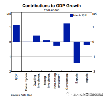 澳洲本国内需求对GDP增长的贡献率为1.6个百分点。民间投资贡献0.9个百分点,居民最终消费支出贡献0.7个百分点。