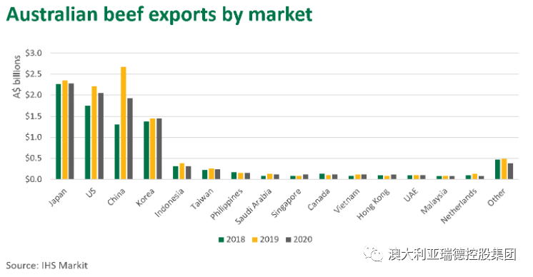 2020年,澳大利亚牛肉出口低于 2019 年的水平,同比下降 11%,至 66.4 亿美元。尽管 2020 年面临挑战,但澳大利亚牛肉出口价格去年增长了 4.5%,表明海外市场对牛肉的需求持续存在。日本、美国和中国是牛肉出口最有价值的市场,然而,价值比 2020 年分别下降了 3%、7% 和 28%。韩国表现强劲,出口额与上年持平。去年肯定表明,与日本、美国和韩国等主要市场的长期关系创造了稳定性并能抵御意外的需求冲击。
