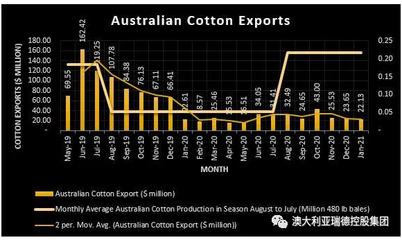 澳大利亚 2020 年的棉花出口为 3.1345 亿美元,月平均为 2612 万美元(2019-20 年:平均 4716 万美元)。如果随着 COVID-19 影响的减少而上升趋势继续下去,预计 2020-21 年的出口量将跃升至每月平均 1.4746 亿美元。
