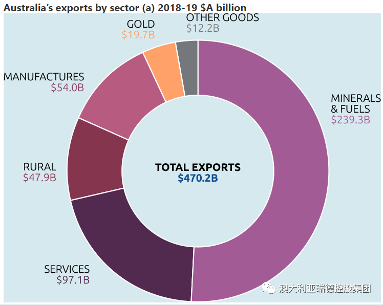 2018-19 年,澳大利亚的矿物和燃料出口增长了 26.4%。澳大利亚的铁矿石、煤炭和天然气出口是澳洲整体出口的前三名,全年分别录得 25.7%、15.3% 和 60.9% 的强劲增长。