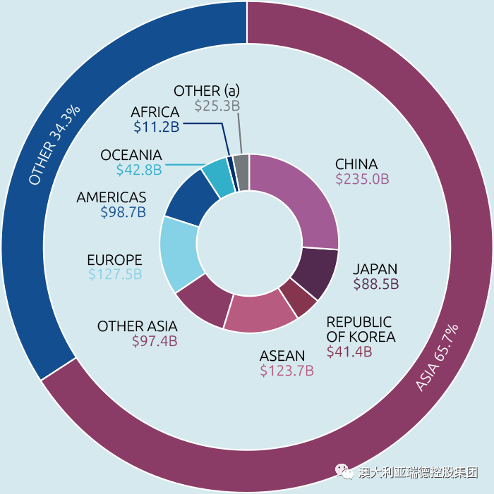 截至2019年6月,赴澳国际游客人数达到860万人次,消费446亿澳元,在澳境内过夜游客的总人数达到1.333亿人次,消费达775亿澳元。中国仍为澳大利亚最大的游客来源国,为澳经济贡献达119亿澳元;整个旅游业占澳GDP的3.2%,每20名澳人中就有一位从事旅游业。