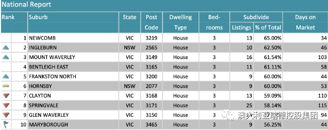其中十个最有机会土地分割的郊区中有八个在维多利亚州。前十名中只有两个在新南威尔士州,没有其他州排名。