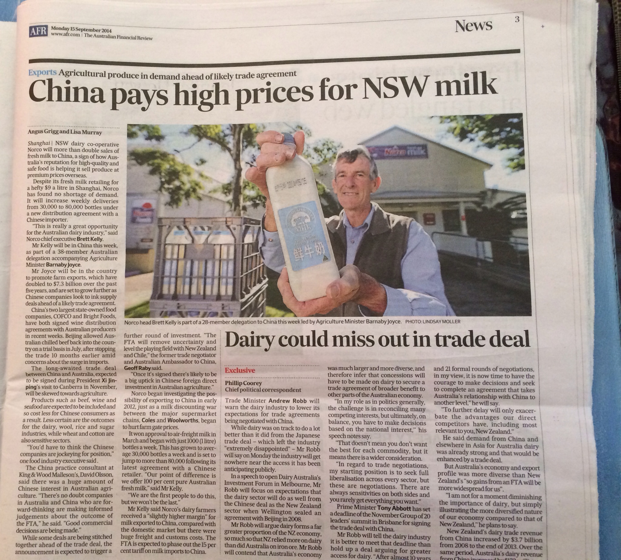 “这的确是为澳大利亚乳品行业的大好机会,”诺科首席执行官布雷特•凯利说。