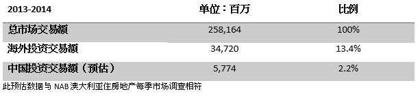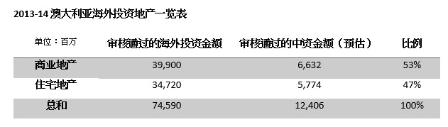 然而, 由于FIRB的数据仅列出审核通过的投资总额, 并没有细分为住宅投资或是商业地产, 因此2013-2014 财务年度58亿澳元的住宅投资额仅为预估值◦具体的数据划分出商业地产或是住宅地产的投资仅列在海外投资类别, 而该类并无各国投资额细节◦