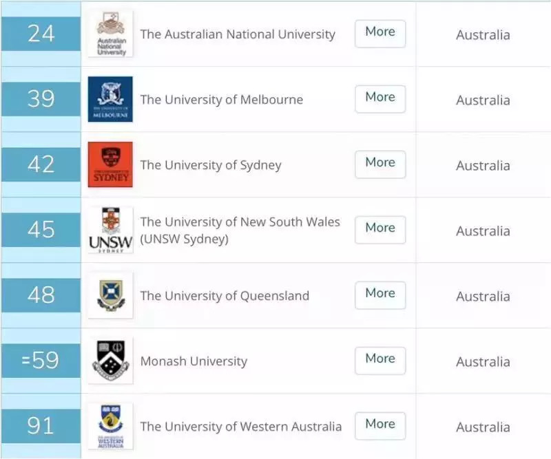 今年澳大利亚有7所学校进入了QS世界大学排名Top 100,澳大利亚国立大学(24名)和墨尔本大学(39名)仍旧占据着前两名的位置,悉尼大学(42名)在今年排名中显著上升,位列第三,新南威尔士大学(45名)、昆士兰大学(48名)、莫纳什大学(59名)、西澳大学(91名)紧随其后。