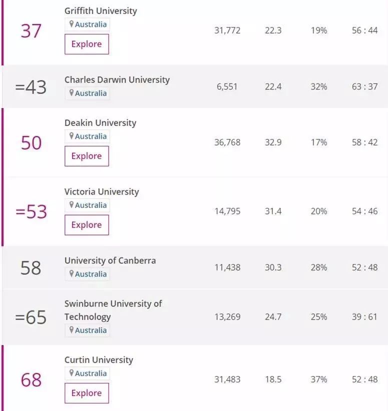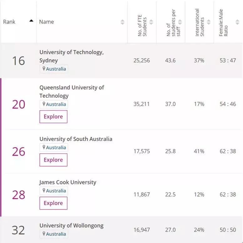 在前50名之中,澳大利亚有8所大学入选。其中,悉尼科技大学和昆士兰科技大学挺进了前20,分别排名第16和第20。南澳大利亚大学、詹姆斯·库克大学、伍伦贡大学、格里菲斯大学、查尔斯·达尔文大学、迪肯大学分别取得了第26、28、32、37、43、50的好名次。另有8所大学位列50—100名之间,它们依次是维多利亚大学(53)、堪培拉大学(58)、斯威本科技大学(65)、科廷大学(68)、西悉尼大学(71)、默多克大学(73)、南十字星大学(98)、墨尔本皇家理工大学(100)。