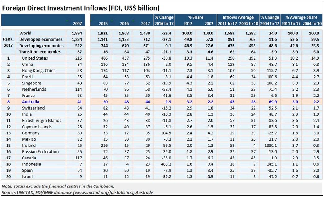 根据联合国贸易和发展会议(UNCTAD)最新发布的《2018年世界投资报告》,2017年流入澳大利亚的外国直接投资(FDI)总额继续保持高位,达到464亿美元(约合623.6亿澳元),澳大利亚再次跻身全球外国直接投资十大目的地国家行列。