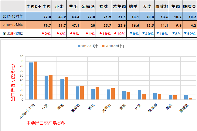 分领域来看,根据ABARES报告,2018-19财年澳农作物产值预计将维持在310亿澳元;畜牧业产值将增长3%至300亿澳元,助推澳农业产值整体增长。