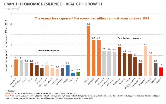 意义更为重大的是,澳大利亚是唯一一个在过去27年连续实现经济不间断增长的发达国家。据其定义,连续两个季度出现经济负增长才被叫做经济衰退。