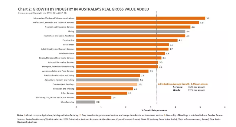 尽管外界对澳大利亚经济的看法总是绕不开矿业与资源,但报告指出,澳大利亚的经济绝不仅限于它们,因为经济产出的四分之三几乎全来自于服务业。