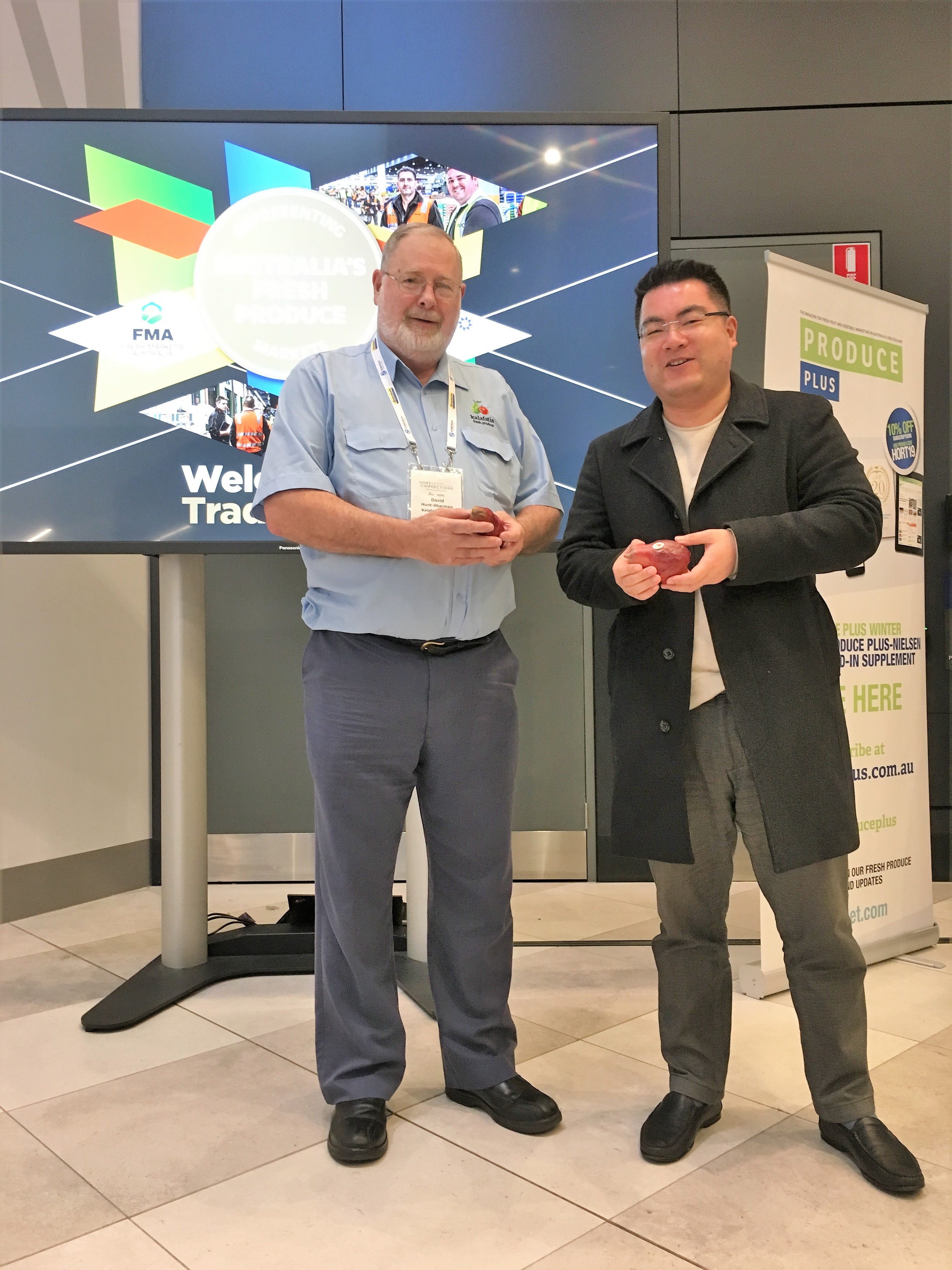 昨天下午,澳大利亚瑞德控股集团董事李总受邀参加Hort Connections澳大利亚水果贸易博览会。现场与来墨尔本参加展会的维州某大型水果种植商CEO David进行交流和讨论。David向李总展示了农场新近培植的新品种Red Angle 梨,并赠予品尝。