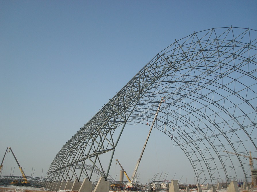 网架由多根杆件按照一定的网络形式通过节点连结而成的空间结构。具有空间受力、重量轻、刚度大、抗震性能好等优点;可用作体育馆、影剧院、展览厅、候车厅、体育场看台雨篷、飞机库、双向大柱网架结构车间等建筑的屋盖。