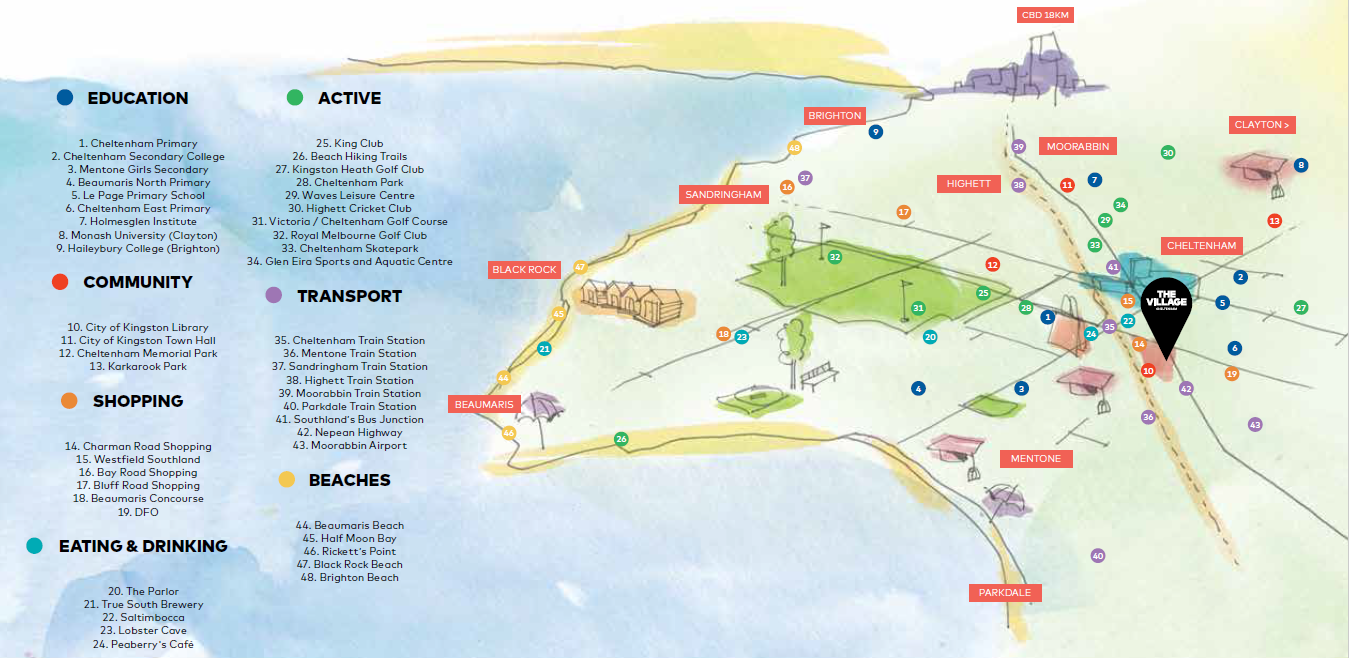 新公寓周围的各种餐饮场所和水坑为您提供令人垂涎欲滴的选择。 在楼下,建议The Village的一楼将容纳一间现代化的餐厅和一间精致的葡萄酒吧。Charman Road距离该项目有100米的步行路程,各种美食,包括泰国菜,印度菜,日本菜和意大利菜。 对于最前沿的东西,您可以选择The Parlour或Black Rock的True South Brewery - 这里有美食家的最爱。著名的Westfield Southland购物中心拥有400多家商店和服务,距离您的新家仅600米。3分钟车距可达Westfield Southland及DFO购物中心和Kingston购物广场,流行商店、电影院、各式美食餐厅及超市应有尽有,一次满足生活所需。