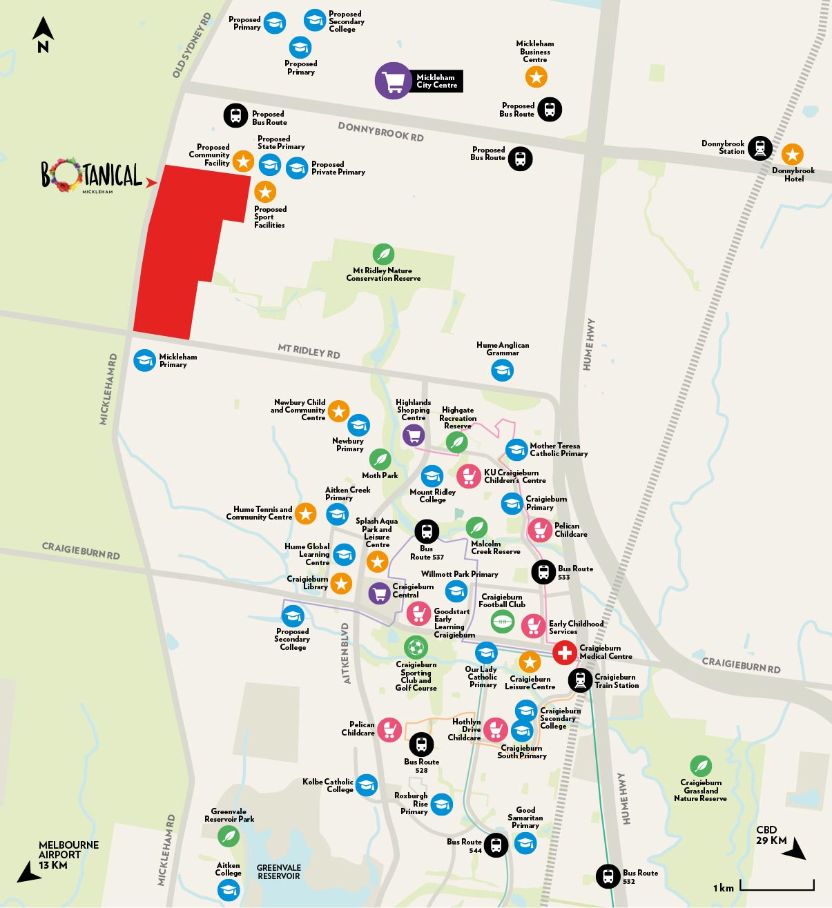 Botanical是Mickleham最新的总体规划社区,拥有2,400个地段,占地超过30公顷的规划开放空间,规划中的购物村,计划中的椭圆体育场和便利店,以及与邻近的未来社区娱乐设施的连接。可通过Tullamarine高速公路轻松抵达墨尔本中央商务区,或从附近的Donnybrook火车站乘坐火车45分钟即可抵达。