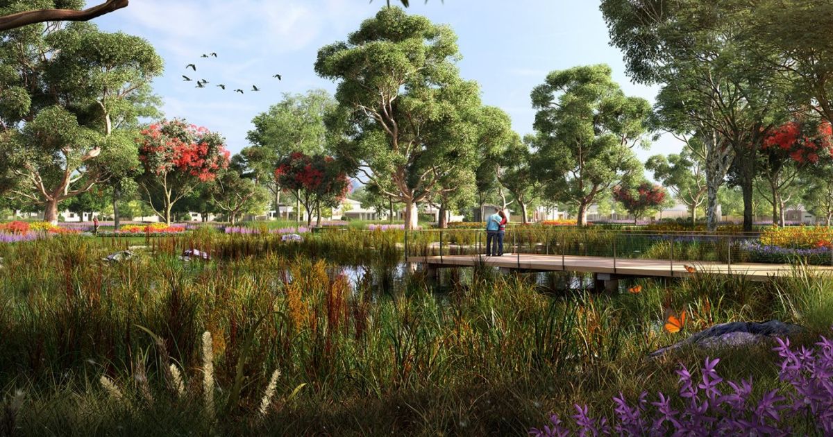 在整个植物园中,将有公顷的郁郁葱葱的绿色植物,口袋公园内衬着高耸的河流红色牙龈,以及规划的运动椭圆形和连接整个社区的广阔的步行和自行车道网络。