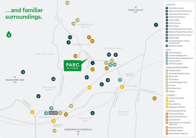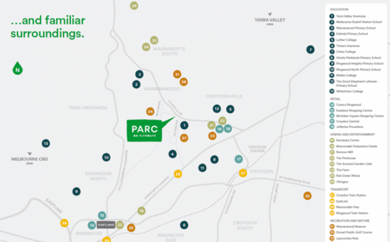 Parc位于充满活力的Maroondah社区,设施完善,设有大量公园,医疗,学校等机构。Council还设有丰富多彩的社区活动,体育赛事以及画展等。社区同时计划至2040年,社区将不断进步,增加更多就业岗位,升级Ringwood火车站,建成 East West link 和North-East Arterial公路,新增Ringwood火车站第三条火车线路以满足增长的客流量的需求等。