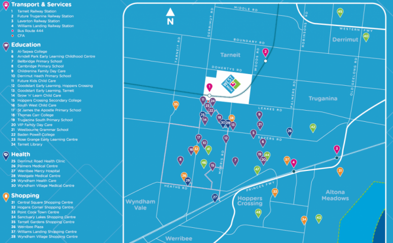 • 由Tarneit和Truganina的Leakes,Derrimut,Dohertys和Woods Rd包围