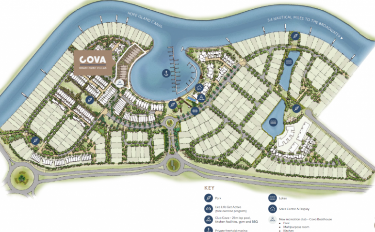 Cova沿着希望岛运河(Hope Island Canal)提供独特的海滨环境,周围环绕着公园和水道,31公顷的土地中有超过四分之一用于休闲区,步行道和水道。是一个自然美丽的地方,在它的中心有一个自由海滨,在希望岛(Hope Island)上建立了大型社区。Cova由澳大利亚Frasers Property公司开发,距离The Broadwater仅3.4海里,为居民提供高档的海滨生活,周围环绕着宁静的公园,湖泊和步行道。
