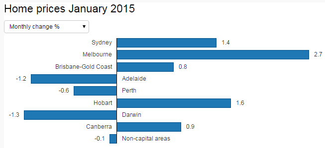 Home prices have kicked off 2015 with further steep rises, led by Melbourne, Sydney and Hobart.