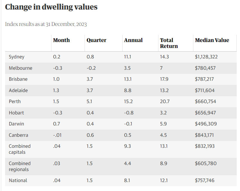 自五月以来,珀斯、阿德莱德和布里斯班的房屋价值每月平均增长超过1%,而在墨尔本和悉尼,自6月份加息以来增长的速度急剧放缓。墨尔本的价值在11月和12月下降,而悉尼的房屋价值在年底两个月的月度增长率仅为0.2%。其他较小的首都城市在大部分时间内表现较弱,霍巴特(-0.8%)和达尔文(-0.1%)在2023年房屋价值出现年度下降,而澳大利亚首都领地则只录得0.5%的涨幅。