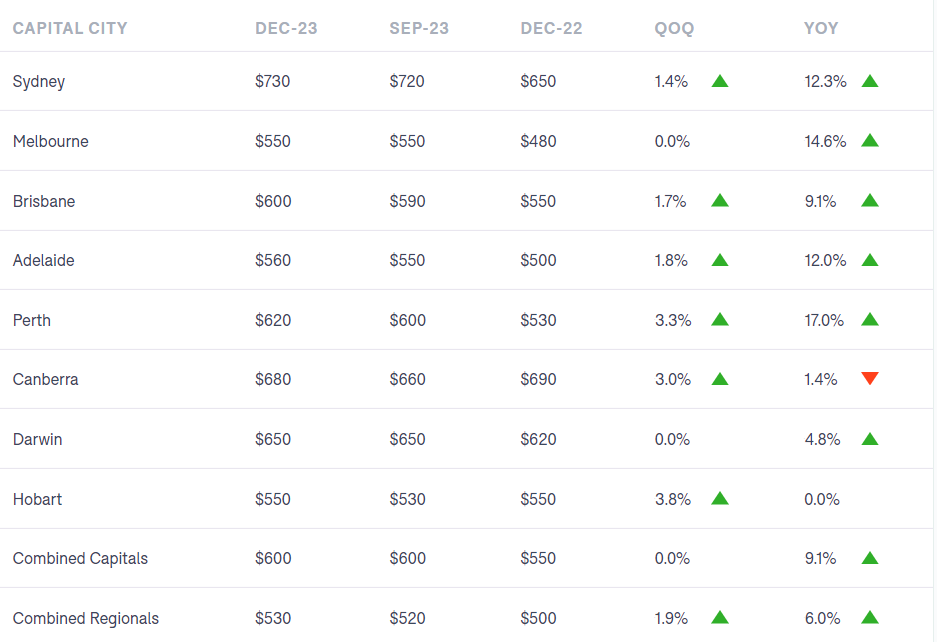 截至2023年12月,Domain测量的综合首都城市房屋的中位租金价格为每周600澳元,同比上涨了创纪录的13.2%。单位的中位租金价格也是每周600澳元,同比上涨了23.7%。