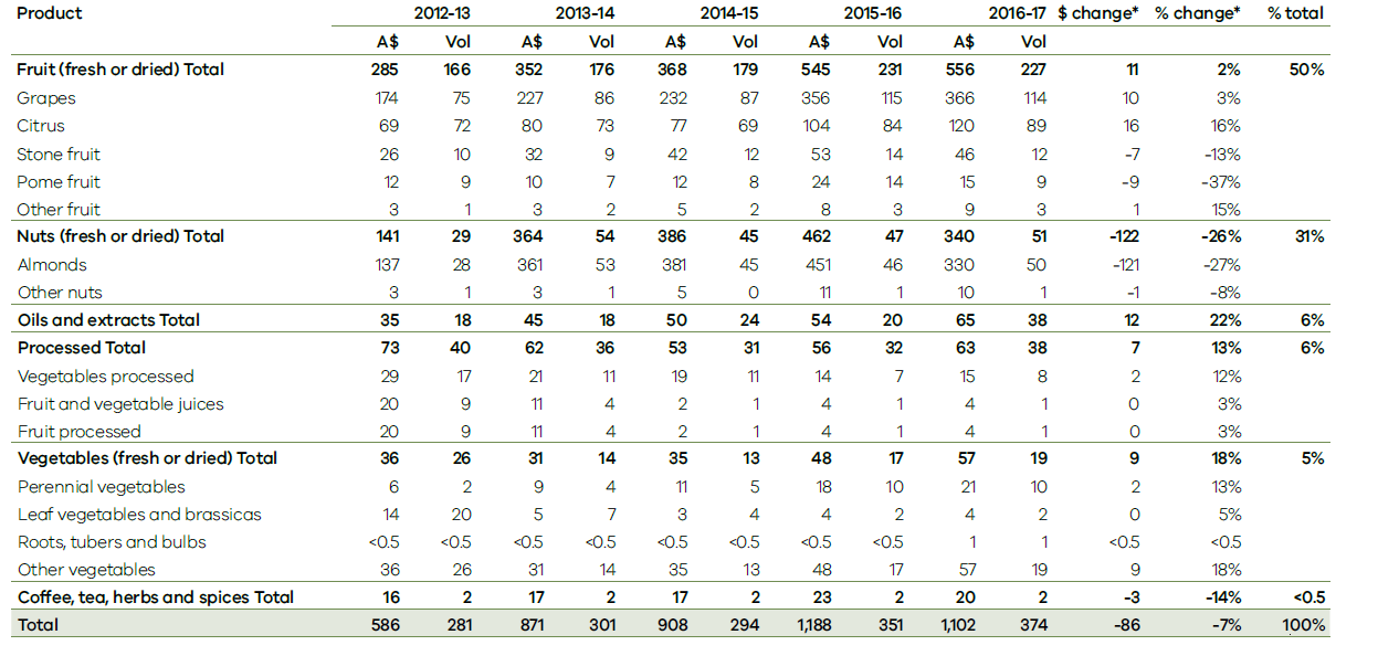 2016 - 17年度维多利亚州的园艺出口价值为11亿澳元,比2015 - 16年度减少了3.74亿美元(下降7%)。 维多利亚州占澳大利亚园艺出口价值的46%。 水果(新鲜或干燥)是价值最高的类别,占维多利亚州园艺出口的50%。 坚果(新鲜或干燥)是第二大最有价值的园艺商品,占园艺出口的31%。 中国是园艺出口的最高价值出口市场,2016 - 17年价值2.03亿美元。 大多数出口(71%)是鲜食葡萄,从2015 - 16年度增加了4500万美元,其次是印度(1.3亿澳元)和香港(8600万澳元)。