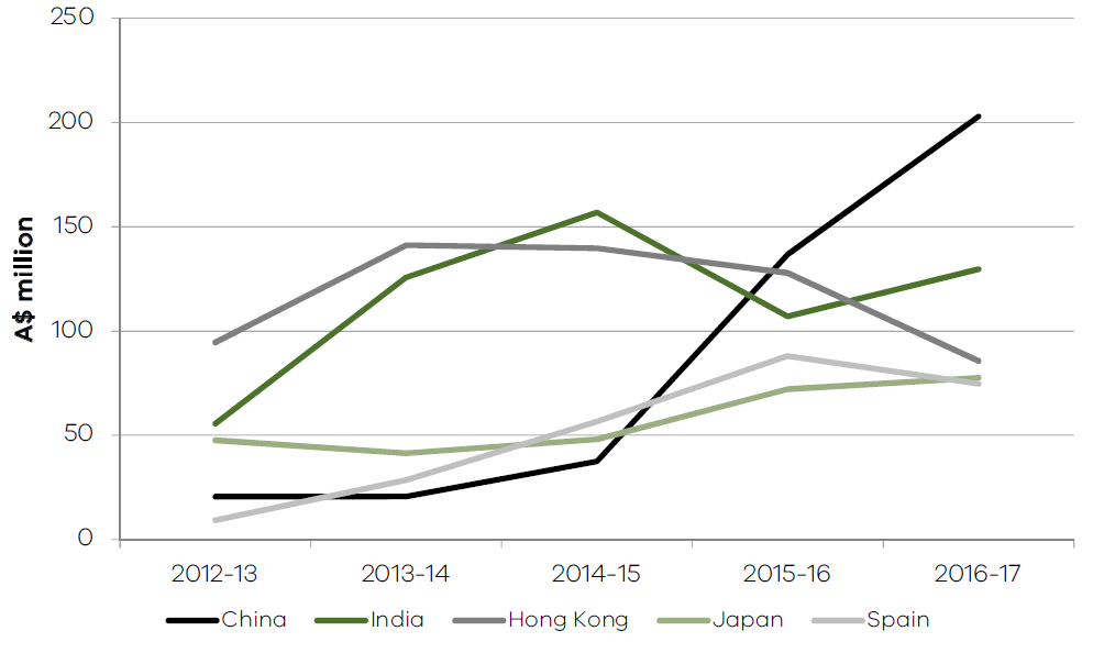 维多利亚州生产了68%的澳大利亚杏仁(5628吨),并在2016 - 17年出口到40个国家。大部分带壳杏仁(20,343吨)出口到印度,和西班牙(9,783吨)。 2016 - 17年鲜食葡萄出口价值为3.49亿美元,占维多利亚州园艺出口的32%,其中41%出口到中国。