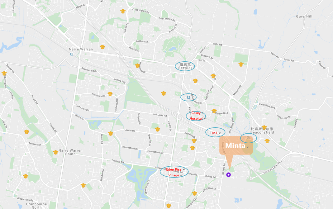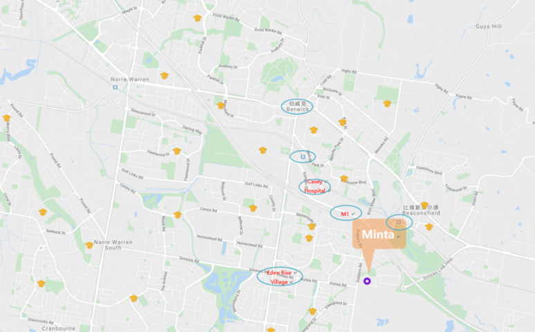 Minta位于墨尔本发达的东区Berwick。距离墨尔本市中心约45公里。它是一个完美的半城郊地区。它是一个充满了家庭氛围的友善社区,拥有现代化的住宅景观,街道和建筑宽敞。沿着绿树成荫历史悠久的主街High St您可以找到许多商店,咖啡厅及餐厅,您可以在周末放松身心,享受惬意的早午餐,不仅如此,这里还有许多大型超市和市场,满足您生活所需。这里还有Wilson植物园,您可以和朋友在这里野餐和BBQ,并欣赏美丽的沿河风景。您也可以到附近的Fountain Gate Shopping Center购物,看电影及享用美食。